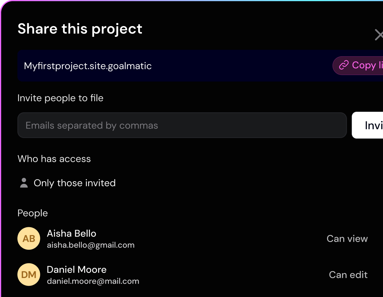 Publish and get a live link to share instantly, export to code, or send an invite to your team to collaborate.